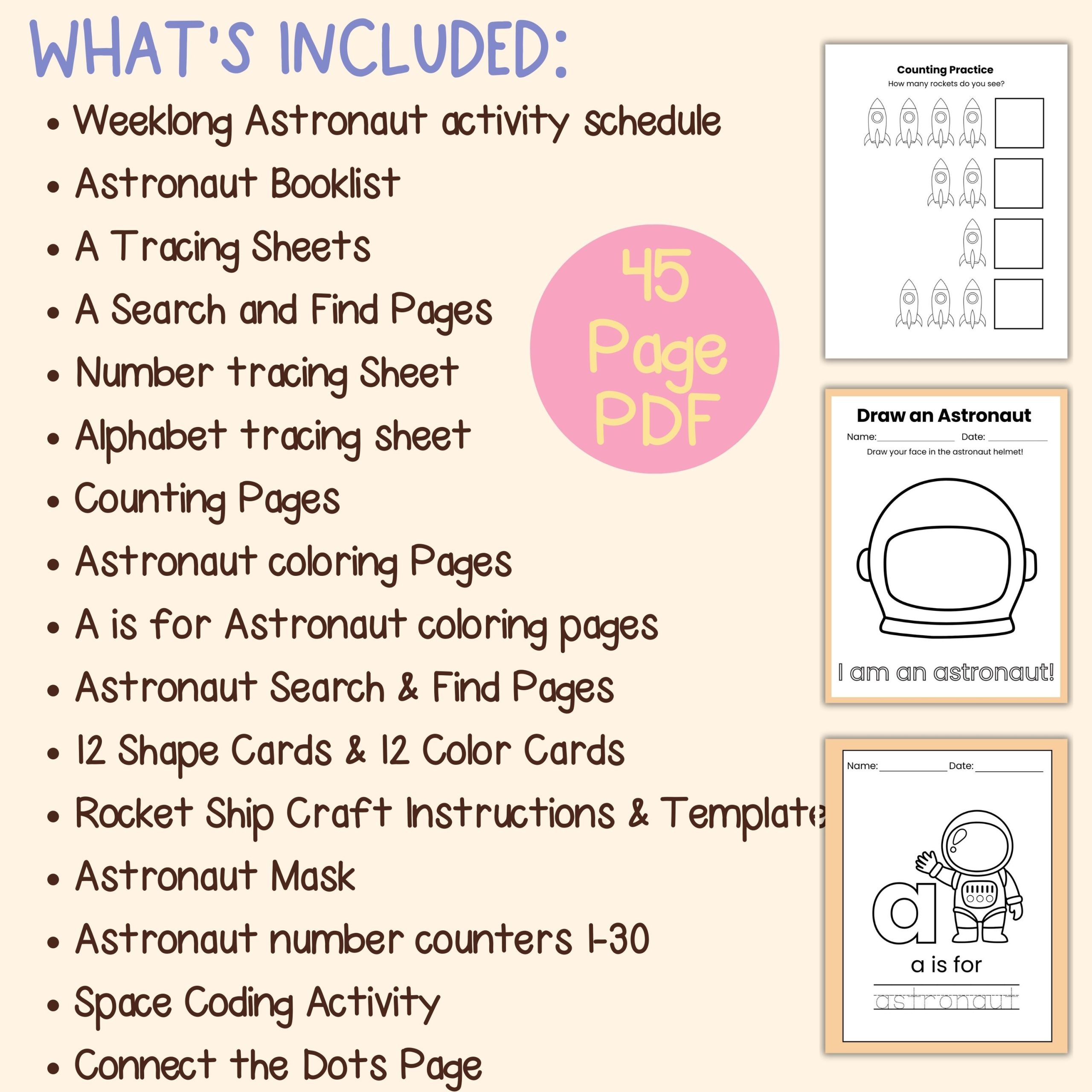 Super Cute Astronaut Preschool Kindergarten Worksheets and Activity Pages. Complete “A” Week Schedule!