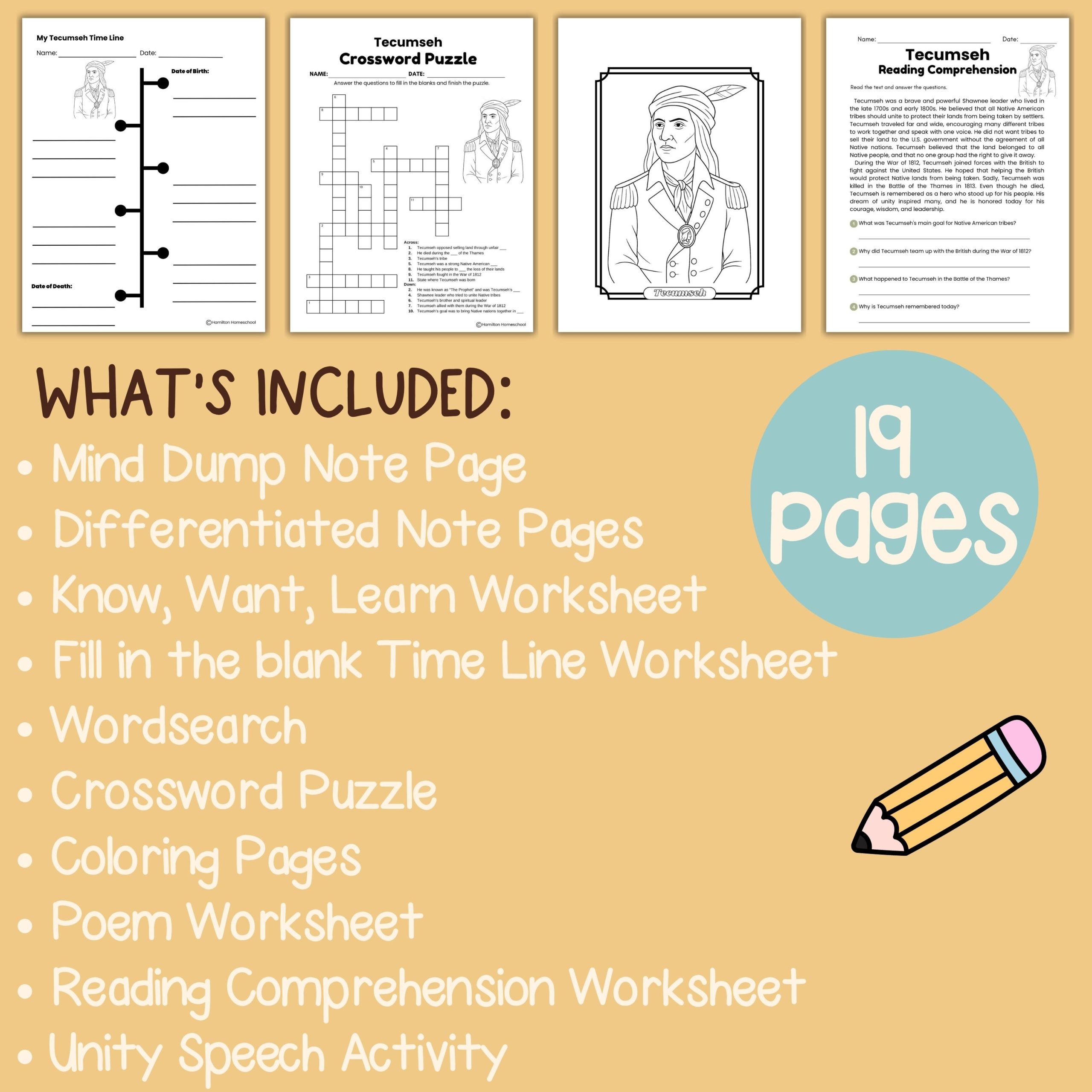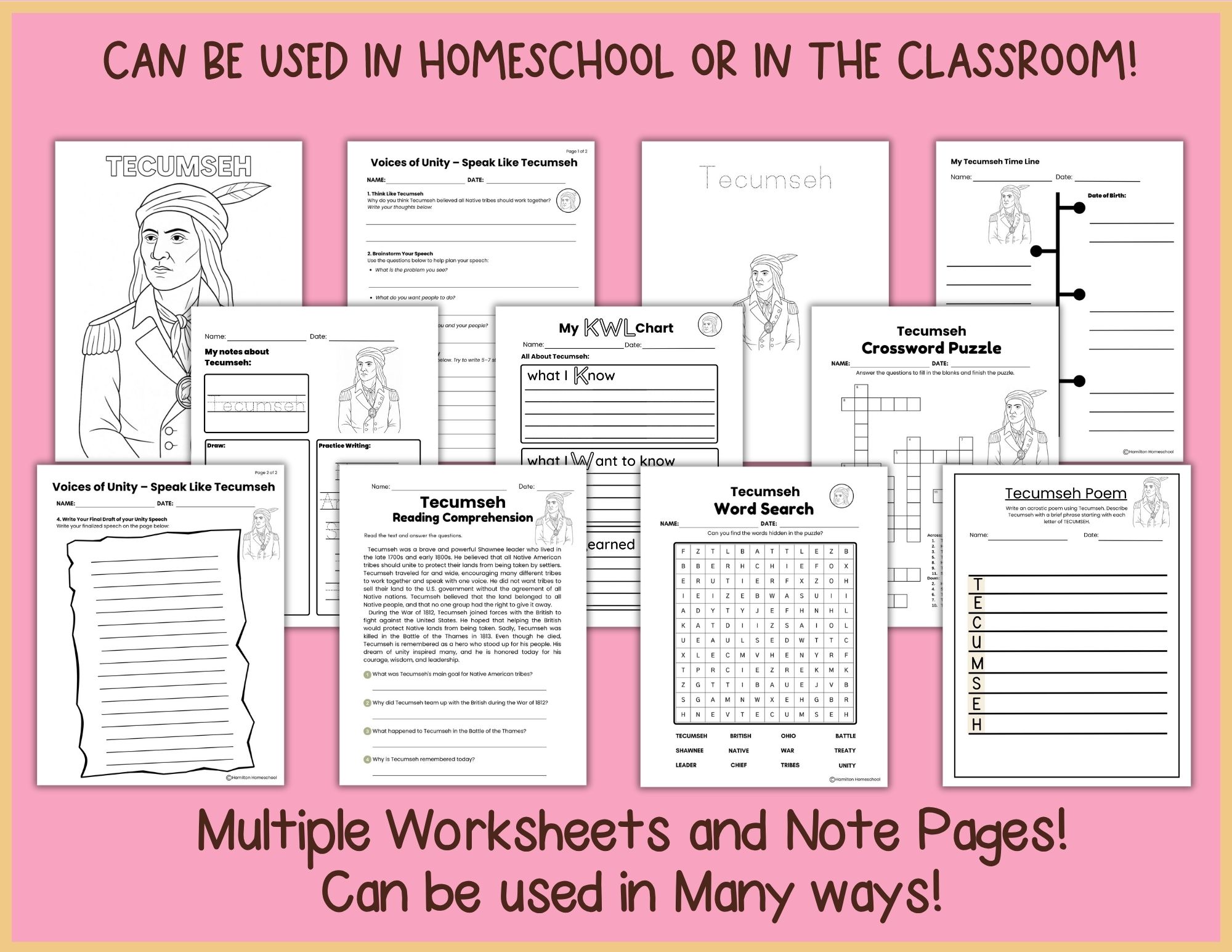 Tecumseh themed note pages and worksheets! Includes coloring page, crossword puzzle and wordsearch!